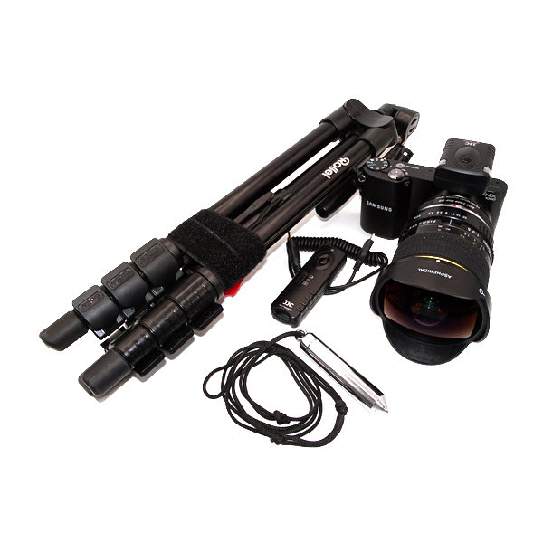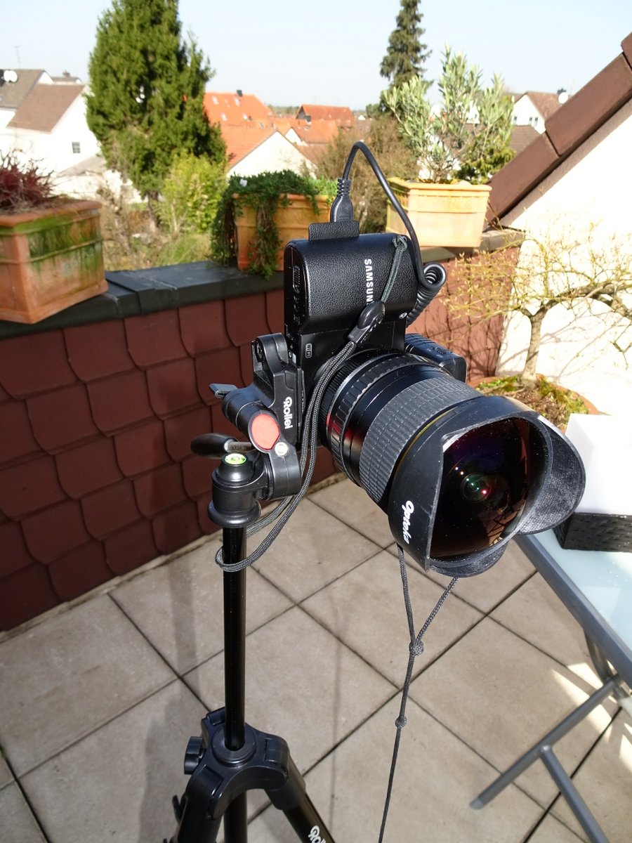 Zum Thema leichtes Gewicht entschied ich mich für meine alte Systemkamera Samsung NX 1000, welche bei Tageslicht sehr gute Fotos macht. Dazu bestellte ich mir einen Adapter für das Opteka 6,5mm Objektiv meiner Canon und ein Leichtgewicht-Stativ von Rollei mit 570 gr. und sehr kleinem Packmaß. Zusammen mit der drahtlosen Fernbedienung lächerliche 1.407 gr.