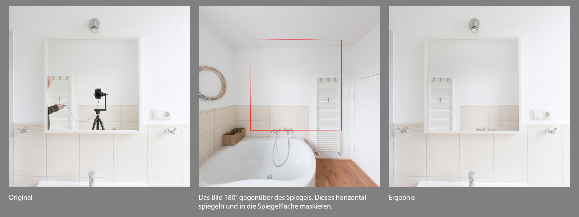 Wenn ich mein Setup in Spiegeln sehe, kopiere ich einfach den Bildinhalt 180° gegenüber des Spiegels in den Spiegel. Die Kamera zeichnet doch das Spiegelbild einmal clean auf. Schon sind Apparat und Stativ verschwunden.