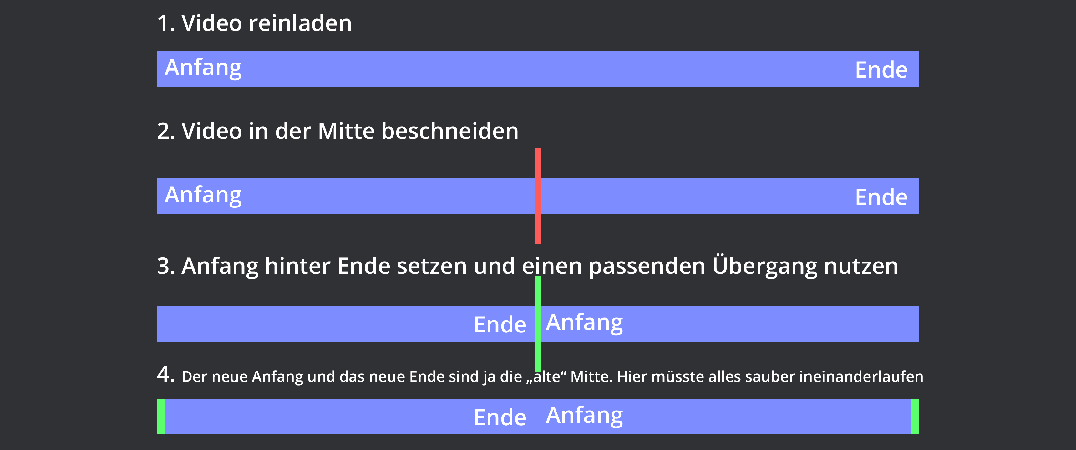 Der "neue" Anfang ist ja quasi die Mitte des Videos gewesen, hier wird es keine "hackligen" Übergänge geben.