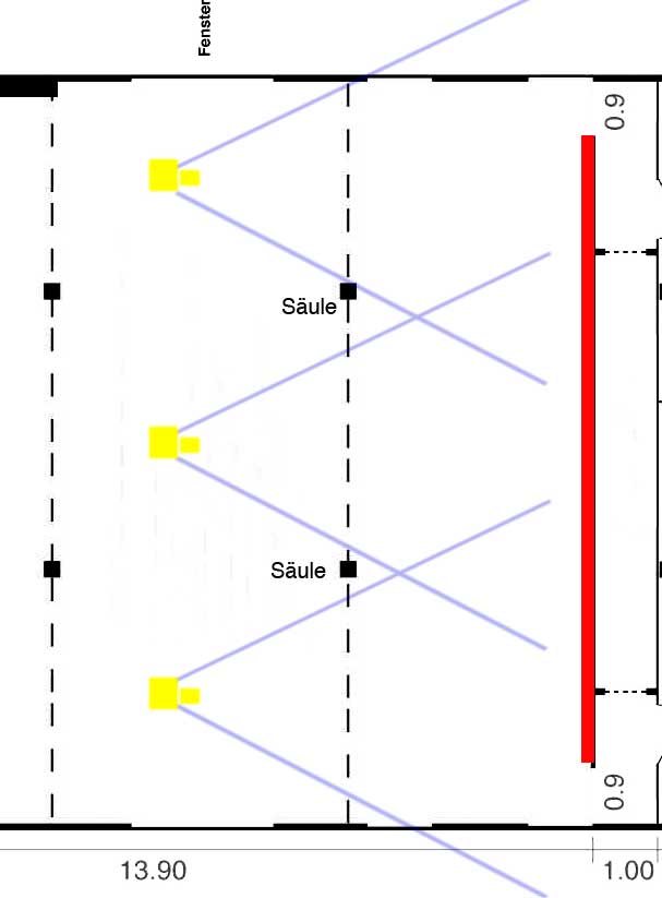 Original von MiFo Erklärung: Blau wären ca die Bildwinkel, die Kamerastandorte sind gelb eingezeichnet.
