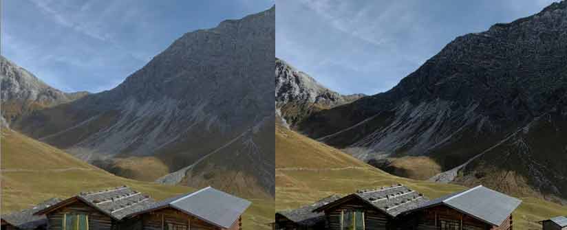 Manchmal klappt es, das man den Schatten in den Tiefen (sind das nun die 3/4tel oder die 1/4tel Töne?) aufzuhellen, die Schwärzen aber trotzdem runterzuziehen, damit steigert man dann den Kontrast im aufgehellten Schatten. Bitte aber mit Einstellungsebenenmaske auf den Berg beschränken.