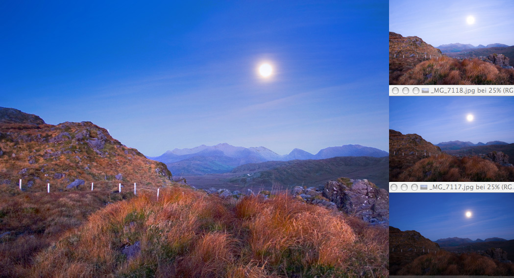 mein-erstes-hdr.jpgIch habe mir gerade PS CS3 als Testversion runtergeladen und die HDR Funktion getestet. Seht selbst. Ich bin schwer beeindruckt. Etwas Märchenhaft siehts wirklich aus, die Langzeitvollmondbelichtung in Kerry's Bergen. In manchen Härtefällen wird PS wahrscheinlich nicht weiterkommen. Aber dafür gibts ja noch unseren herrlichen Geist, der sich zu helfen weiss.