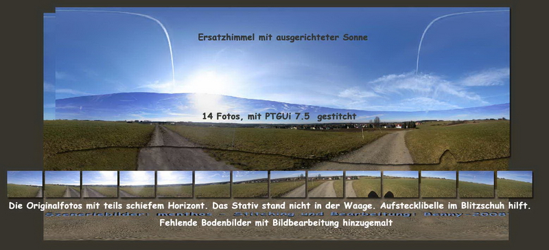 www.szenerien.de will ich künftig Interessierten mit Tipps, Tricks und auch aktiver Hilfe zur Seite stehen, wenn ihnen ein Versuch einer selbst erstellten Szenerie nicht gelingt. An diesem Beispiel wird ganz gut deutlich, was mit einigen Kniffen noch aus Bildern entstehen kann, die auf den ersten Blick unbrauchbar erscheinen. Hier war es trotz des eingesetzten Stativs ein schiefer Horizont, der es nötig machte, in jedem Bild mit PTGUi 7.5 vertikale Kontrollpunkte zu setzen. Nur dadurch konnte der hügelige Horizont in sich gerade gerückt werden. Hilfreich waren dabei die lotrechten Häuserfassaden und einige Gitter und Masten. Natürlich ist das Ergebnis nicht wirklich schön und nur in seiner Funktion als Modellflug-Simulator-Szenerie einigermaßen sinnvoll. Da man sich hier beim Fliegen sowieso meist im oberen Bilddrittel bewegt, fällt der wegen der fehlenden Bodenbilder dazugemalte Boden kaum auf. Der Fotograf ist übrigens erst 14 Jahre alt und es war sein erster Versuch einer Szeneriefotografie.