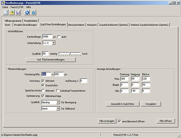 Das Panorama kann schon so gross bleiben. Zuerst konvertiert man das Panorama zum Würfel. Dann retuschiere ich eventuelle Löcher im Boden- und Himmelbild (Ausbessern-Werkzeug). Dann erstelle ich erst den QuickTime Film. Siehe angehängtes Bild. Mit den Einstellungen erreicht man eine gute Qualität bei einer Dateigrösse von 700 kByte bis 1,2 MByte. Was mir noch aufgefallen ist: bei deinem Panorama war der Horizont nicht genau mittig im Bild sondern viel zu weit oben. Beim fertigen QuickTime Film sieht dadurch der Horizont völlig verzehrt aus (oder "rund"). Beispiel: Fertiges Panorama von Autostich hat eine Grösse von 5000x2000 Pixel. Normal für ein Kugelpanorama wäre aber 5000x2500 Pixel. Wieder Photoshop, Funktion "Bild-Arbeitsfläche..." jetzt erweitert man das Panorama auf eine Höhe von 2500 Pixel - das heißt genau so das der Horizont genau mittig im Bild ist. Ich messe zum Teil mit einem Lineal am Bildschirm. Die entstandenen weißen Streifen bzw. nach dem Umwandeln in die Würfelseiten, Löcher, retuschiert man wieder mit dem Ausbessern Werkzeug zu. Wenn du kein Photoshop benutzt schreibe ich natürlich eine kleine Anleitung auch für andere Programme. Bei dir sind ja schon sehr gute Versuche zu sehen- jetzt wäre es an der Zeit mal einen Nodalpunktadapter zu besorgen, selberzubauen.