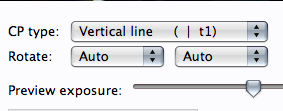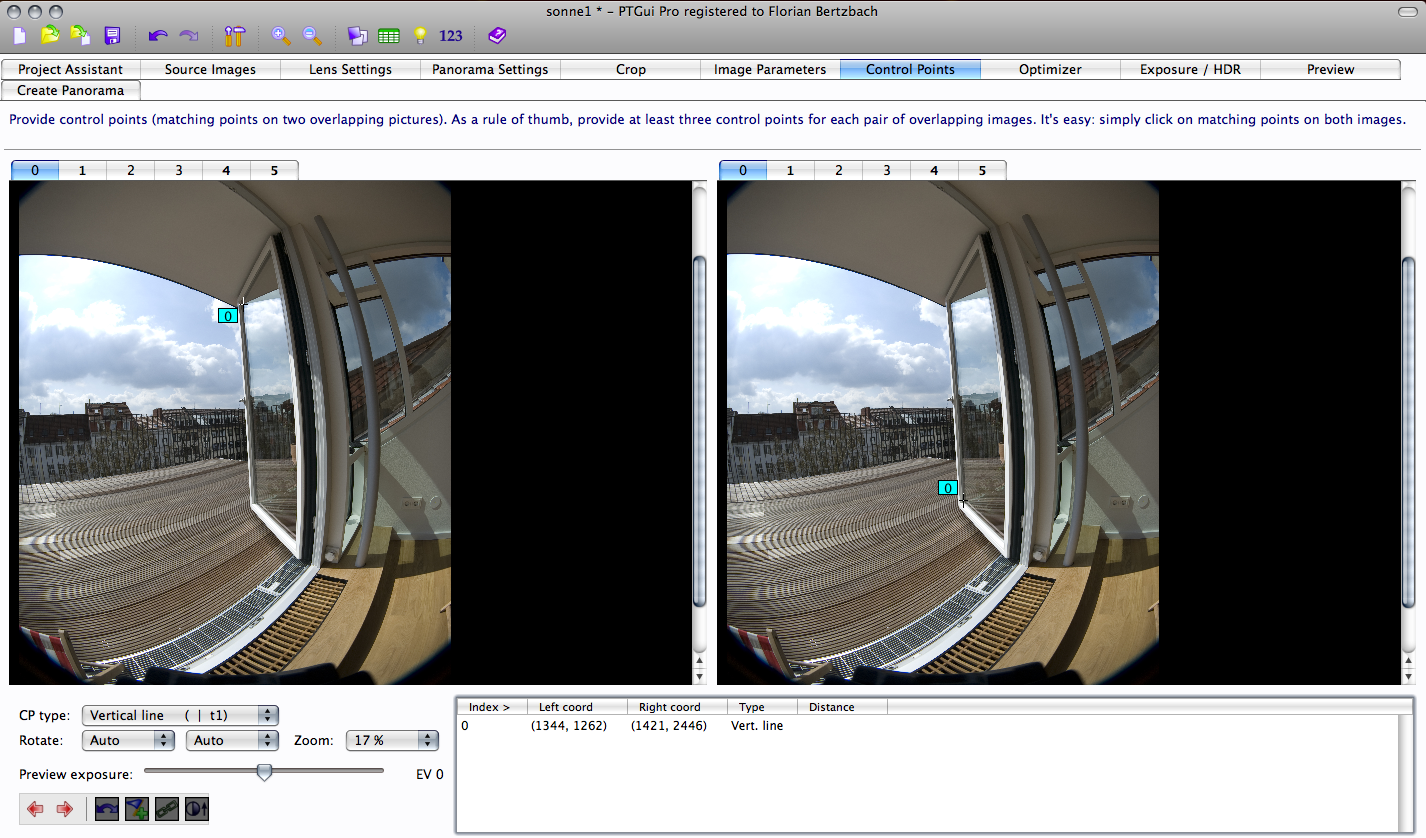 Im Controlpoint editor lädst Du links und rechts das selbe Bild. Du wirst sehen, dass im Feld CP type (unten links) die Anzeige umspringt von "normal" auf "Vertical line (| t1)". Jetzt suchst Du Dir eine Senkrechte linie im linken Bild, legst einen Kontrollpunkt am oberen Ende der Linie, den zeiten Kontrollpunkt im rechten Bild legst Du an das untere Ende der selben linie. Diese Linie wird dann senkrecht ausgerichtet werden. Das kannst Du in mehreren Bildpaaren machen und dann sollte diese Linien eigentlich nache´her senkrecht stehen.