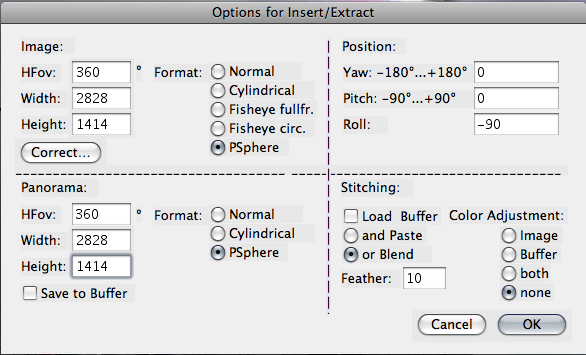 Also Du kannst natürlich panotools auf dem mac benutzen, tue ich auch, Bild 1.png findest Du bei Kekus Wann nehme ich CS + Ebenen und wann Panotools? CS und Ebenen geht gut bei Landschaft und großen Räumen Panotools + Nadir in CS einfügen geht gut bei komplizierten geometrischen Mustern (Fliesen, Backsteine). Im zweiten Fall gebe ich zunächst das Pano ohne Nadir als Tiff aus und das Nadir Bild dann extra, oft schiebe ich das einfach händisch im Pano Editor nach unten ungefähr an die richtige Stelle, höre mir das Gemecker von ptgui über fehlende cp´s an und lasse nur den Nadir rechnen. In CS wnadele ich dann das Pano und das Nadir bild mit Panotools um Bild 2.png Bild 4.png Bild 5.png mit dem Lasso tool kopiere ich ein ordentliches STück vom Nadir und füge es in das Pano ein; mit apfel/V schiebe ich es an die richtige Stelle und mit Apfel T und eingeschalteter Perspektivkorrektur bei halb transparenter Ansicht korrigiere ich die Fliesenkanten bis sie passen. Dann lege ich einen Alpha Kanal dahinter und "Blende mit dem Pinselwerkzeug die Übergänge; anschließend bringe ich das Bild auf eine Eben zurück und verwandele es mit Panotools zurück (Statt extract dann insert, sonst steht es Kopf :)) Ok, die "Gebrauchsanweisung steht im Panotools Wiki, ist nicht auf meinem Mist gewachsen. Und das ist die Notlösung, wenn ich mit einfacheren Wegen scheitere. Aber kleine Räume haben es in sich und wollen genau überlegt sein! Und das mit der Kuh ist in kleinen Räumen auch ziemlich schwer... ich meine die am Panokopf... Flo