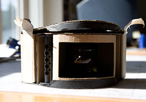 die fisheykamera hat eine (zusammensetztbare) plastikkugel, die mit Wasser (zum Brechen der Lichtstrahlen) gefüllt ist. Die Blende (Stück schallblatte mit Loch ist im zentrum der Kugel - deswegen zusammensetzbar). die Filmeben verläuft paralell, also um die kugel herum - die brennweite beträgt 50mm (entspricht durchmesser der kugel), format ist 4.5x9 die kugel hab ich dann mit schwarzem tape so abgklebt, dass nur das nötigste an auschnitt licht hineinlässt. Der wasserstand hat in den letzten 15 Jahren leider etwas gelitten.
