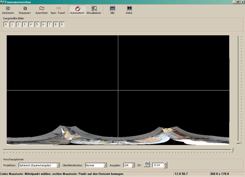 Habe ich das richtig verstanden: rechts unten im Vorschaufenster steht 108°, da sollte eigentlich aber annähernd 360° stehen? Hugin kapiert also nicht, dass meine Bilder eine komplette Umdrehung darstellen?