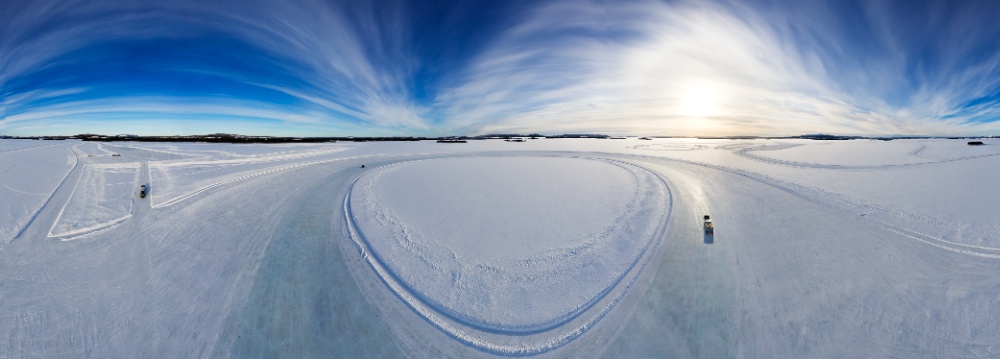 Wenn hier schon Helipanos auftauchen, kann ich ja auch mal noch eines zeigen. Automobil-Teststrecke auf einem zugefrorenen See in Nordschweden, Flughöhe ca. 80 Meter über dem Eis. Ach, und nicht wundern, daß man sich da nicht drinrumdrehen kann, ich arbeite praktisch nur für Print...