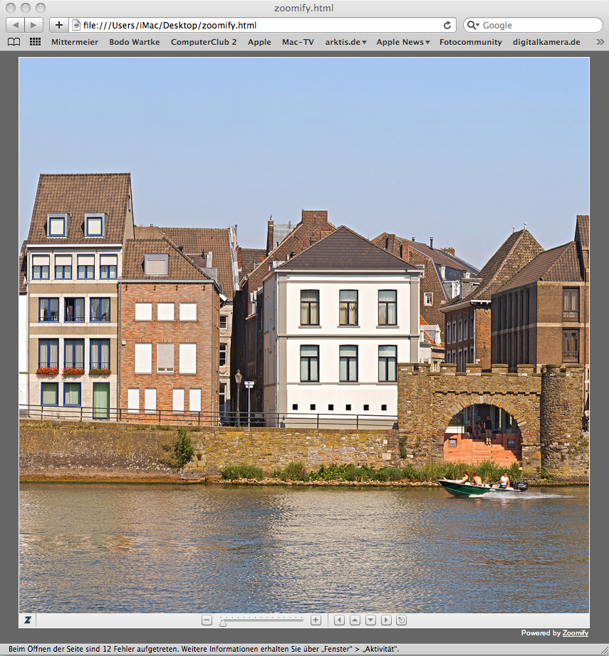 Einen schönen Tag wünsche ich euch Ich habe 2 Probleme mit dem Ergebnis, dass ich bei meinem ersten ernsthaften Versuch mit dem Zoomify Export in Photoshop erzielt habe: 1. Wenn man maximal herauszoomt geht das nur solange, bis obere und untere Bildkante erreicht sind (siehe erster Screenshot) das ist bei einem Pano mit einem Verhältnis von vielleicht 10:1 natürlich nicht wirklich ideal. Ich würde gerne so weit herauszoomen können bis die seitlichen Kanten erreicht sind. Das ist aber eher das kleinere Problem, ich könnte mich zur Not damit arrangieren. 2. Wenn man maximal herauszoomt ist das Bild auch stark komprimiert und sehr unscharf. (siehe wieder 1ter Screenshot) Wenn man etwas weiter hereinzoomt und die nächste Auflösung geladen wird, ist alles wieder in Ordnung. (siehe 2ter Screenshot) Ich habe aus einem PSB-File mit etwa 1,16GP den Zoomify-Export mit höchster Qualität und 1000x1000px Fenstergröße aufgerufen. Ich hoffe mal, dass es irgendwie eine Möglichkeit gibt wenigstens Punkt 2 zu beheben, denn der PS-Export soll ja laut zoomify.com qualitativ uneingeschränkt sein. Im Moment scheint Strato ein Server abgebrannt zu sein, sonst würde ich euch das ganze natürlich als Link angeben. PS: Safari gibt an, dass 12 Fehler aufgetreten sind. Angeblich existieren 12 Bilder nicht. Die sind aber (wenn ich mir die Namen ansehe) in einer so geringen Auflösung, dass ich mir Problem 2 so nicht erklären kann. Ich bedanke mich schonmal für alle Anworten. Gruß, WALL*E