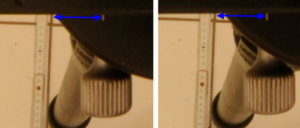 Nein! Meiner Meinung nach muss die Schiene bei dem Test immer parallel zum Lineal stehen und eine Markierung ortsfest am Stativ sein, z.B. eine Stecknadel an das Stativ kleben, die sich nicht mit dreht.