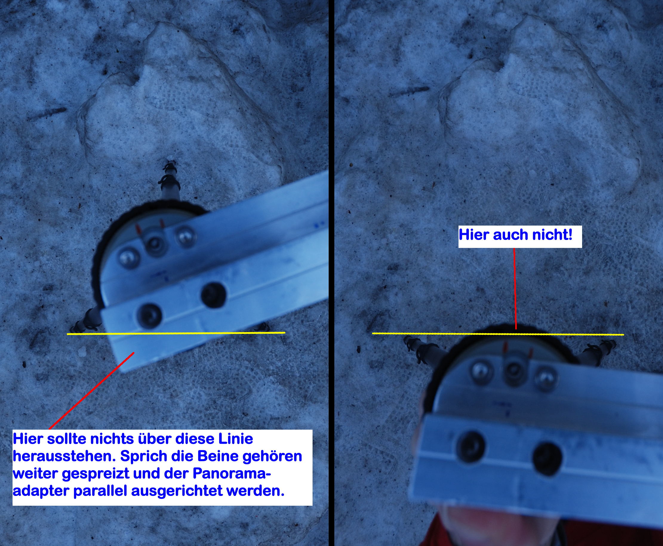 Du kannst bei meiner vorgeschlagenen Methode das Fisheye auch so weit in die Horizontale schwenken, dass die zwei Stativbeine gerade nicht mehr drauf sind. Da die Kamera rein theoretisch im Nodalpunkt ist, ist die Blickrichtung egal.