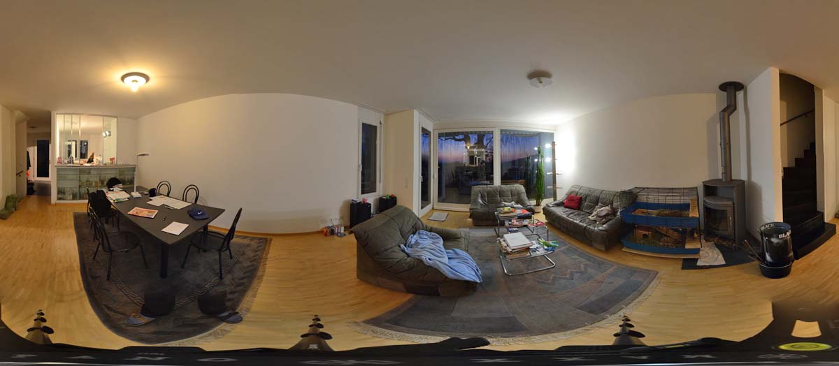 Ich arbeite mittlerweile allerdings nicht mehr so. Das war meine Arbeitsweise zu Realviz-Sticher-Zeiten, als das Ergebnis der Stitcherei ein Quicktime-Movie war und kein equirectangulares Bild. Das Retuschieren im equirectangularen Bild ist zwar mühsam, aber bei einfachen Problemen möglich. Natürlich nicht in der Mitte von Nadiz und Zenith.