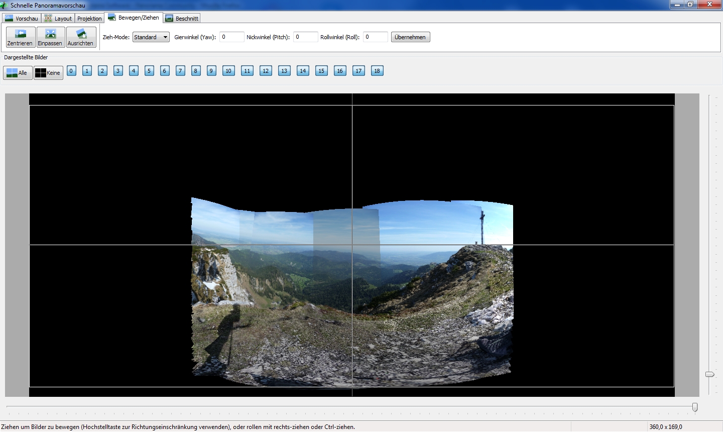 Im OpenGL Vorschaufenster kann ich das Pano über den Reiter "Bewegen/Ziehen" einwandfrei ziehen, allerdings wird dabei nie die komplette Rundumsicht angezeigt und eben auch das Pano nur für ca 180 Grad gerechnet.