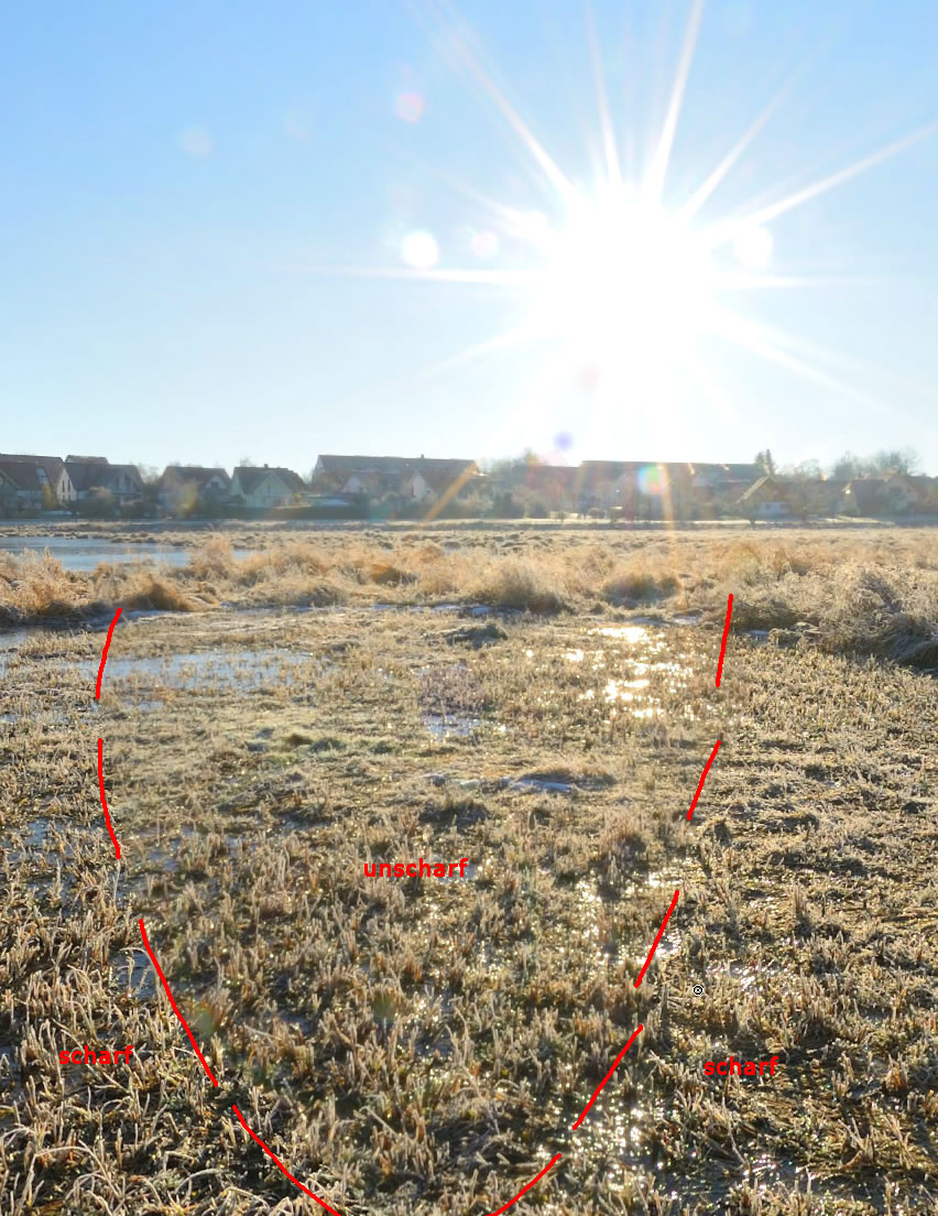 Tja, das war mein "wohl misslungener" Versuch, mit Blende 22 einen schönen Sonnenstern hinzubekommen. Das ganze Pano habe ich mit Blende 6,7 gemacht und zum Schluss noch Mal mit Blende 22 das Sonnenbild. Das Objektiv hat, wie ich feststelle, einfach ein Bisschen viel Staub auf der Frontlinse, der bei Blende 22 im Gegenlicht aufleuchtet.