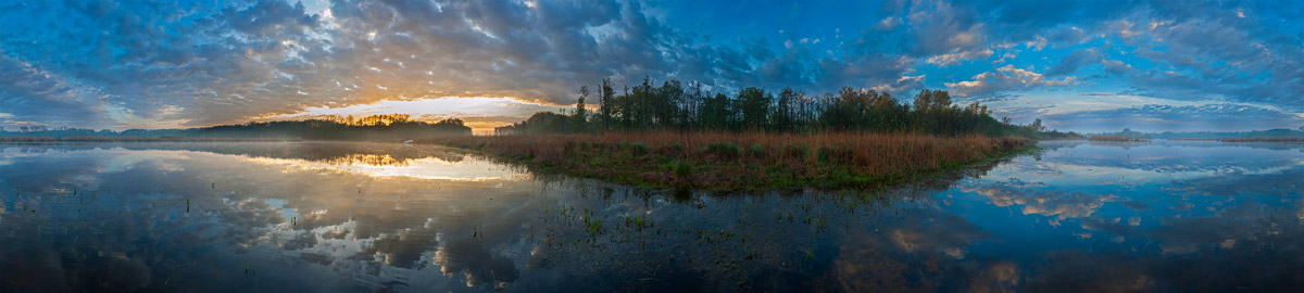 1. Das Panorama in einem kleinen Zeitfenster von ein paar Tagen zu schießen (Frühlingsmotiv mit hellgrüner, nicht zu weit fortgeschrittener Vegetation -> Erlen)