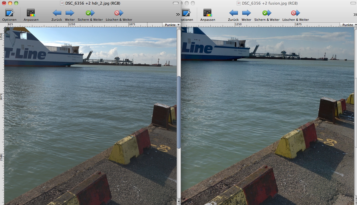 . Ich habe deine Datei mal durch LR4 gejagt und das Ergebnis ins SNS geschmissen und die generierung der Pseudo-HDR-Reihe gänzlich dem SNS überlassen und das ist herausbekommen. Ich finde die Pseudo HDR Version sehr interessant, weil sie im Schatten auf dem Teer mehr Zeichnung und Kontrast generiert.