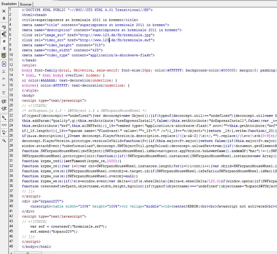 Das funktioniert bei mir einfach nicht. Kann sich vielleicht einer mal meine html Datei im Anhang anschauen? Ich benutzt halt Pano2VR aber das sollte ja nichts machen, solange der header stimmt oder?