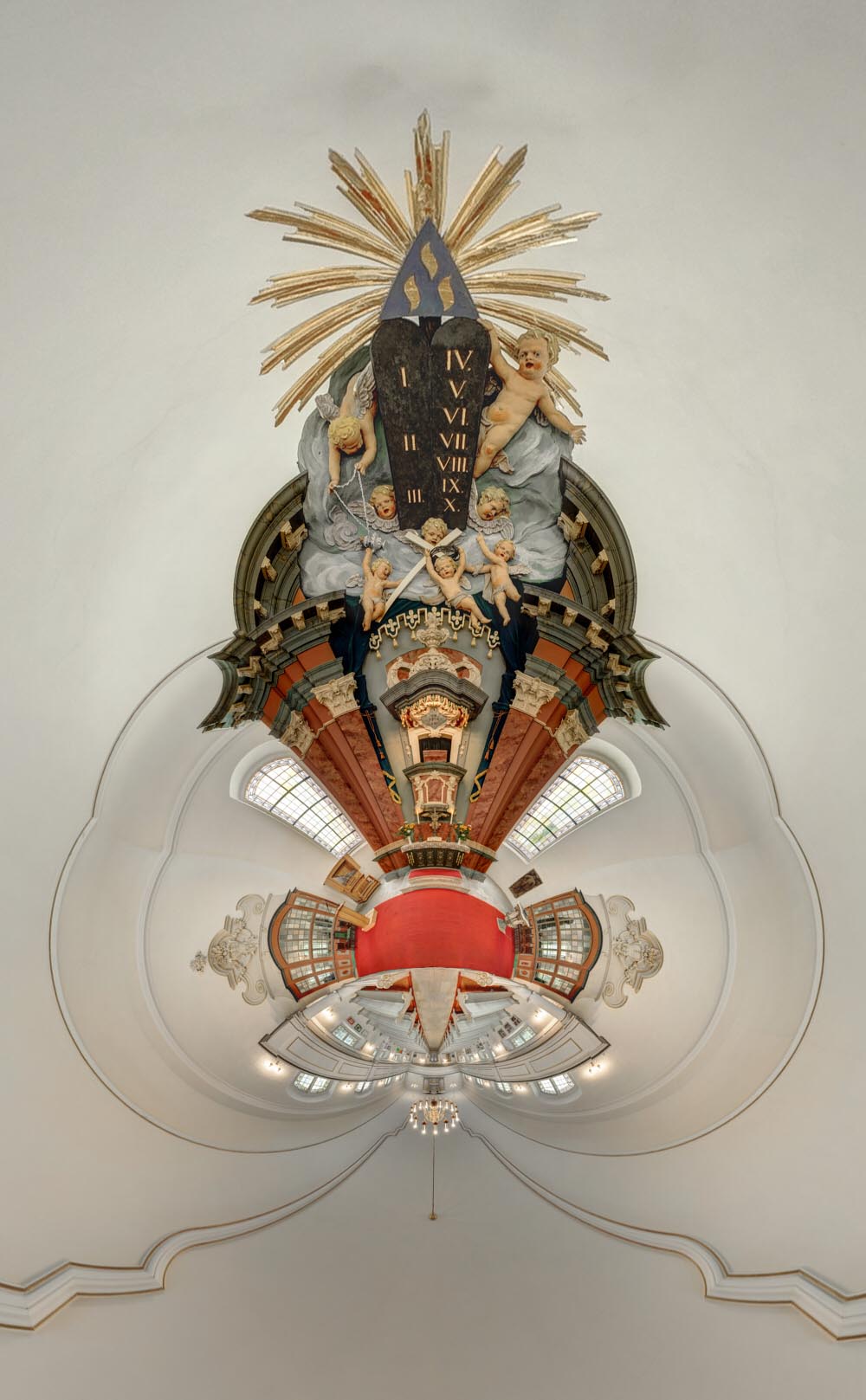 sehr schön, vor allem der "Schmetterling", der Dein Little-Planet ergibt. Gut, dass Du Dich genau da auf den roten Teppich gestellt hast, sonst ergäbe es nicht diese horizontale Linie im "Schmetterling". Toll, dass die Deckeneinfassung so eine schöne Kontur ergibt.