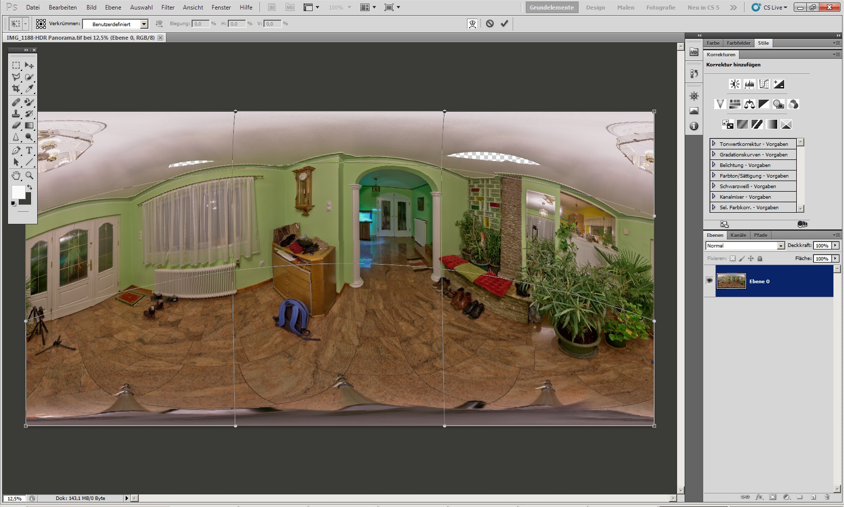 In deinem Bildbeispiel ist die vertikale Verzerrung sehr deutlich an der Höhe des Schranks in der Bildmitte (links) zu erkennen. Der ist nach der Transformation viel höher. Das darf in meinem Beispiel so bei den Häusern nicht geschehen. Daher habe ich mir eine Möglichkeit gewünscht, selektiv Bildteile im Wesentlichen unverzerrt zu versetzen und die notwendige Verzerrung auf Bildteile zu begrenzen, bei denen die Transformation nicht so auffällt.