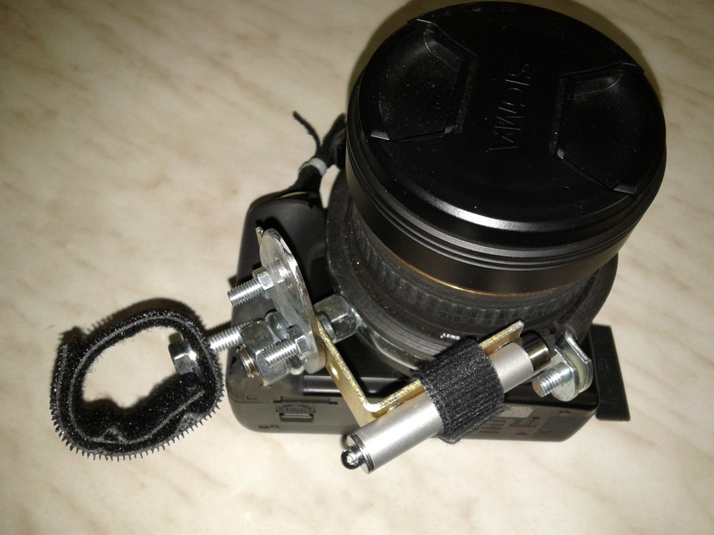 Gefunden habe ich dann den Beitrag über das Laserstativ von Malum. Dort wurde ja schon die Idee einer kardanischen Aufhängung angesprochen. Kurz drüber nachgedacht, als zu kompliziert verworfen. Vielleicht einfach nur die Kamera über ihrem Schwerpunkt aufhängen, das müßte doch eigentlich auch reichen. Ab in die Garage zur Schrottkiste (nein, ich meine nicht mein Auto, sondern mein "Teilelager"). Einen Laserpointer hatte ich auch noch und so bastelte ich mir mit aus einem Winkel, Klett- und Klebeband und besagtem Laserpointer einen "biomechanischen NPP-Adapter".