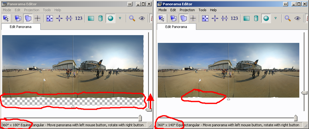 Im Panorama-Editor steht unten links die vom Bild abgedeckte Fläche. Beim kompletten Equi sind das 360 x 180°.