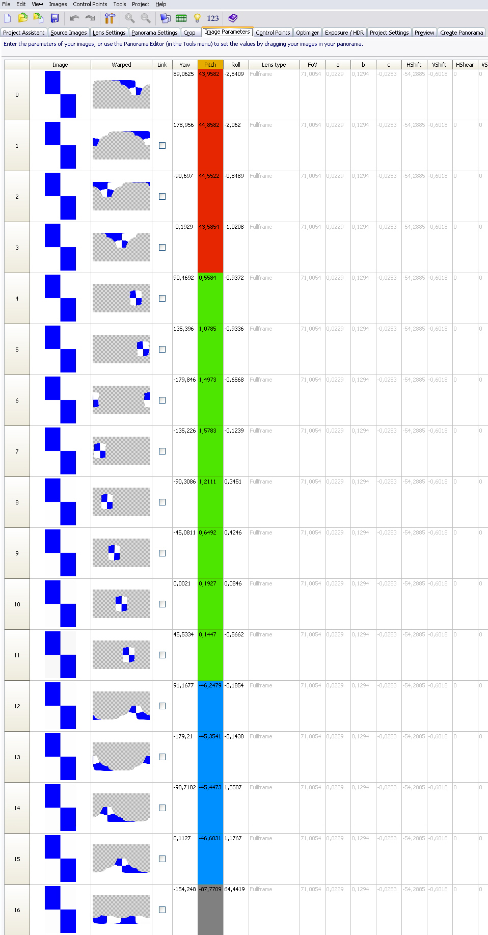 In der Spalte "Pitch" bei den "Image-Parameters" verbergen sich nämlich in etwa die vertikalen Winkel, die Du eingestellt hast (nach dem Stitchen, wohlgemerkt).