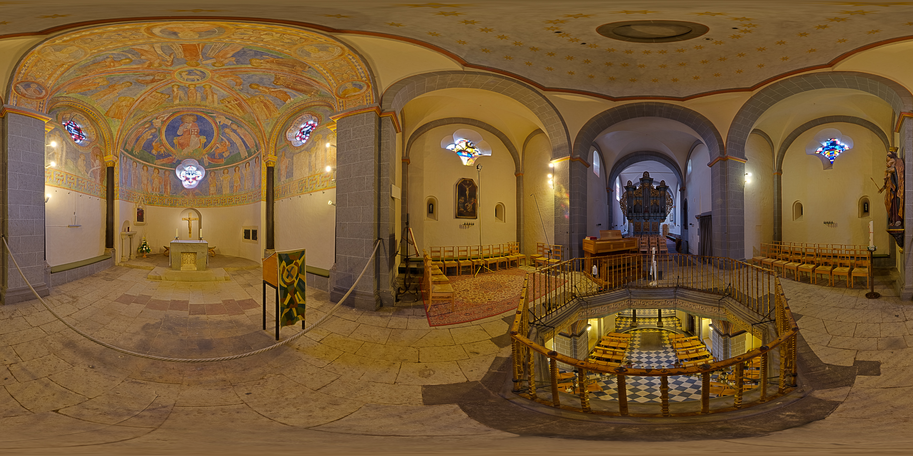 Ansonsten ein schönes Panorama von dieser Kirche. Was meinst Du, wäre es für den Betrachter evtl. interessanter, die Startansicht so auf den oberen Hauptaltar einzustellen, dass man auch noch etwas von der "unteren Etage" sieht? Das würde das Besondere dieser Kirche sofort ins Auge springen lassen.