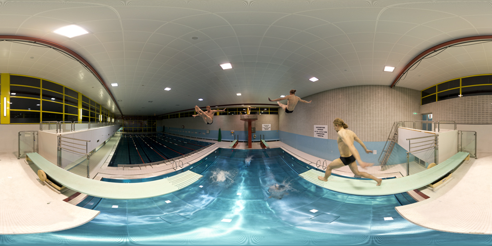 Für das Pano machte ich 60 Einzelbilder und 15 verwendete ich für die Kugel. Das Shooting machte ich mit einem Pole auf meinem Stativ aufgelegt und ein paar Fotos freihand mit Pole auf dem Sprungbrett. Das Pano habe ich gestitcht und die Springer alle seperat mit Viewpoint und seperate Layers reingezerrt und radiert.