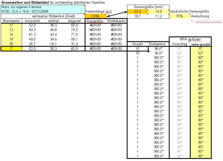 Das Berechnungstool läuft bei mir nicht, ich habe kein Excel. Ich überschlage die benötigten Bilder anhand der Bildwinkel. Das 14er hat etwa 75° an der langen Bildkante. Für Panoramen ohne Bewegung kommst Du zur Not auch mit etwa 20% Überlappung aus, d.h. es werden für das Pano 6+8+6+1 Bilder benötigt. Die Zenitaufnahme könnt man sich zur Not schenken, aber ehe es Probleme mit einem kleinen Loch im Zenit oder Anschlußfehler bei Wolken gibt würde ich diese Aufnahme trotzdem machen. Damit ergibt sich also 1+6+8+6+1 als Mindestbildanzahl.