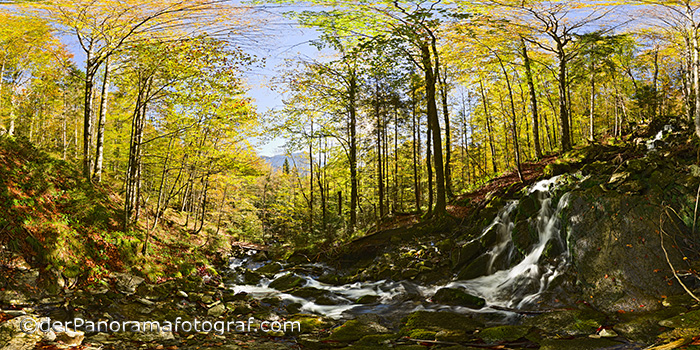 Dieses Panorama entstand an einem fantastischen Herbsttag bei einem kleinen Ausflug in der Nähe von Kreuth in den bayerischen Alpen. Was hier nach einem lichten Wald aussieht, war besonders im Schatten sehr viel dunkler. Um das auszugleichen, fotografierte ich eine 3er-Belichtungsreihe. Für ein HDR-Pano war sie aber aus zwei Gründen nicht zu gebrauchen. Die Bäume bewegten sich im Wind (-kürzeste Belichtung) und der Wasserfall sollte den Eindruck der Bewegung vermitteln (-längste Belichtung). Mit PTGui entwickelte ich die kürzeste Belichtung zum Pano und liess mir die längeren Belichtungen als einzelne Ebenen ausgeben. In Photoshop übereinandergelegt und mit Masken versehen, wurde erst die mittlere und zum Schluss die längste Belichtung in den gewünschten Bereichen eingeblendet: