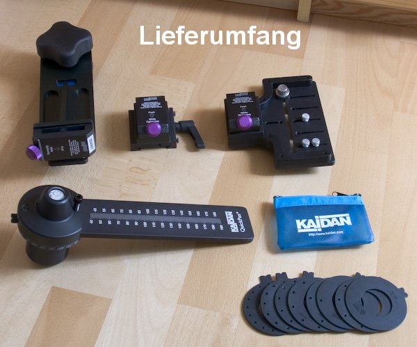 Die Vorteile des Kaidan sind das geringe Gewicht, das sehr kompakte Packmaß und die universelle Einsetzbarkeit. Die Universal-Kameraplatte lässt sich in beiden Richtungen montieren, so dass von Fisheyes mit sehr kurzem Abstand der Kamera zum Nodalpunkt bis hin zu langen Teleobjektiven (z.B. 200mm-Objektive für Gigapixel-Panoramas) alles eingesetzt werden kann.