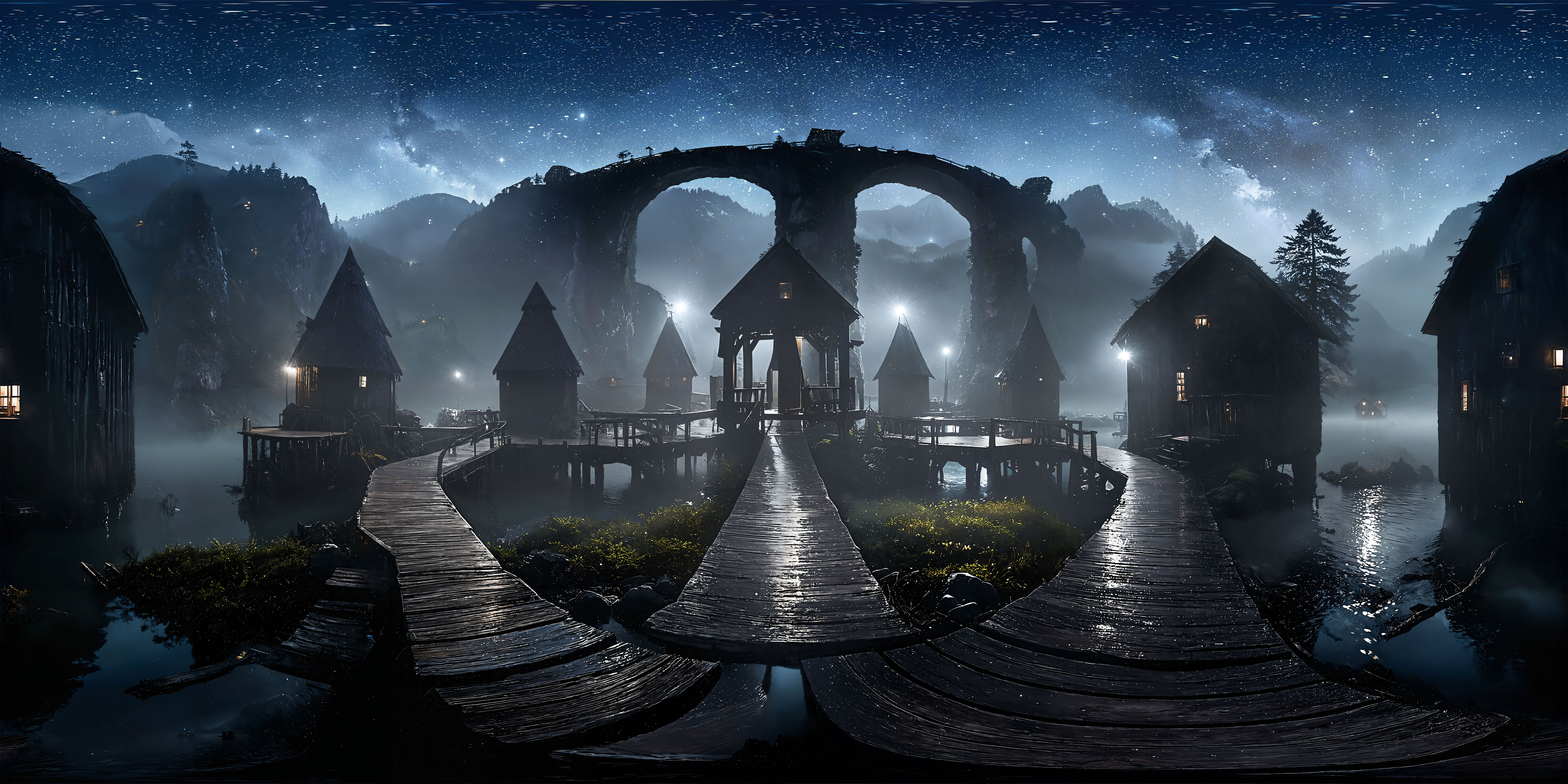 dark photo of a few wooden huts within a blue mountain lake in dense fog, some stars in the sky, wooden walkways in the water, few lights at the huts, high bridge with two arches in the background, steep rock faces with spruce trees in the background, very dark, highly detailed, 360 degrees realistic equirectangular panoramic photo, 8k, high resolution, photo realistic, rich colors