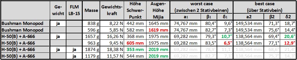 1.) Ohne Nivelliereinrichtung ist das A-666 auf H-50 mit meinem DIY-Gewicht der Sieger. Es würde erst ab einer Neigung von 10,7° im worst case und 20,6° im best case kippen. Dabei ist das Auge der Mijia in einer Höhe von 1,975m - 33cm über dem des Bushman!