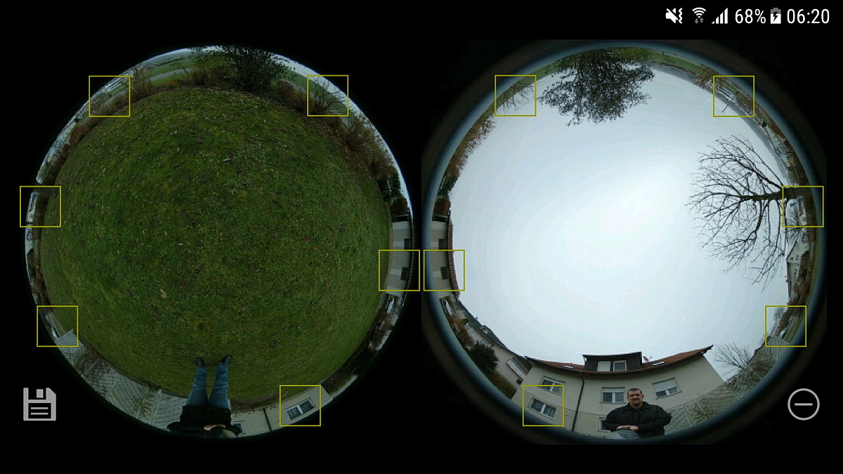 Wie kriegst Du eigentlich die beiden Halbklugeln am einfachsten in den MiSphere Converter? Geht das nur über den Umweg per Micro-SD-Karte und PC oder auch direkt per Funk/Handy?Die Kalibrierung wird mit den beiden Halbkugeln durchgeführt, nicht im fertigen Pano!