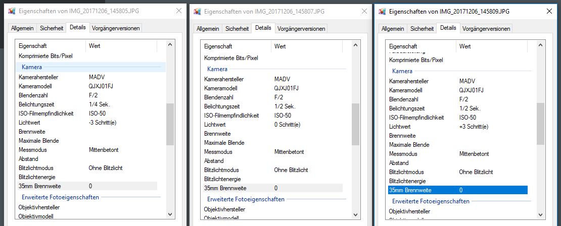 Ich habe bracketing +-1 Blende eingestellt. Leider haben alle 3 Bilder die gleiche Belichtungszeit von 1/2 sek.
