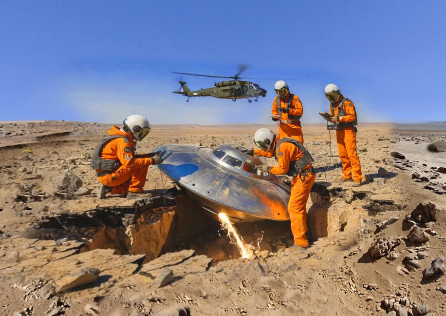 Subject: Three figures in yellow hazmat suits are excavating a metallic, disc-shaped object from the ground. The scene depicts an alien spacecraft partially unearthed within a shallow crater.