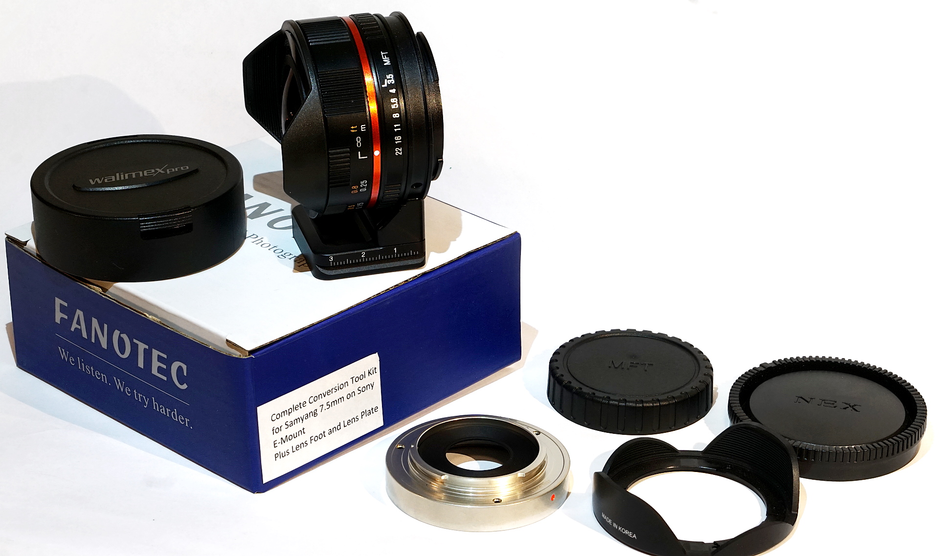 Sowohl Fanotec Conversion Kit (129$) als auch Objektiv in OVP.