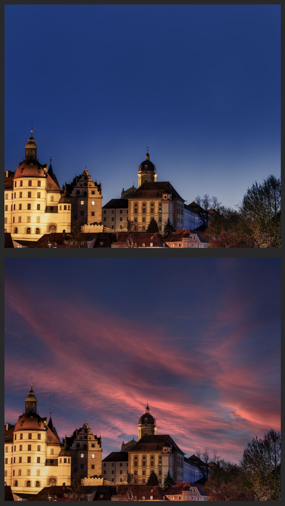 Den Himmel auszutauschen kriege ich - nicht gerade ein Bildbearbeitungsprofi - ja vielleicht gerade noch hin, aber wie ich den an der leicht gekräuselten und somit fein strukturierten Wasseroberfläche im Vordergrund gespiegelten Himmel, der auch diese Streifen hat (sieht man auch im screenshot), ersetzen kann habe ich keine Ahnung. Hättest Du dafür einen Vorschlag?