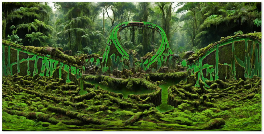 ((((deep green tropical steamy dense rainforest with trees everywhere)))), 360 degrees realistic equirectangular panorama photo, heavily corroded rotten rusted moss-covered rollercoaster, (((moss-covered human skeletons sitting in 3 carts))), looking straight to the front, 8k, high resolution, photo realistic, rich colors, <lora:Cloudify-SDXL:1.5> <lora:View360:0.7>