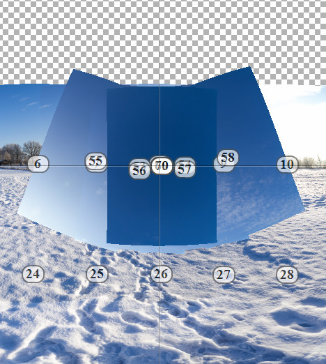 Beim Probedurchlauf der 0°-Reihe kann man erkennen, ob sich alle bodennahen Objekte noch im Bildbereich befinden und wenn das zutrifft, die nächste Himmelreihe vertikal so einrichten, dass nur noch Himmel abgebildet wird (z.B. 45°). Danach die Himmelbilder wie im Tutorial beschrieben anordnen.