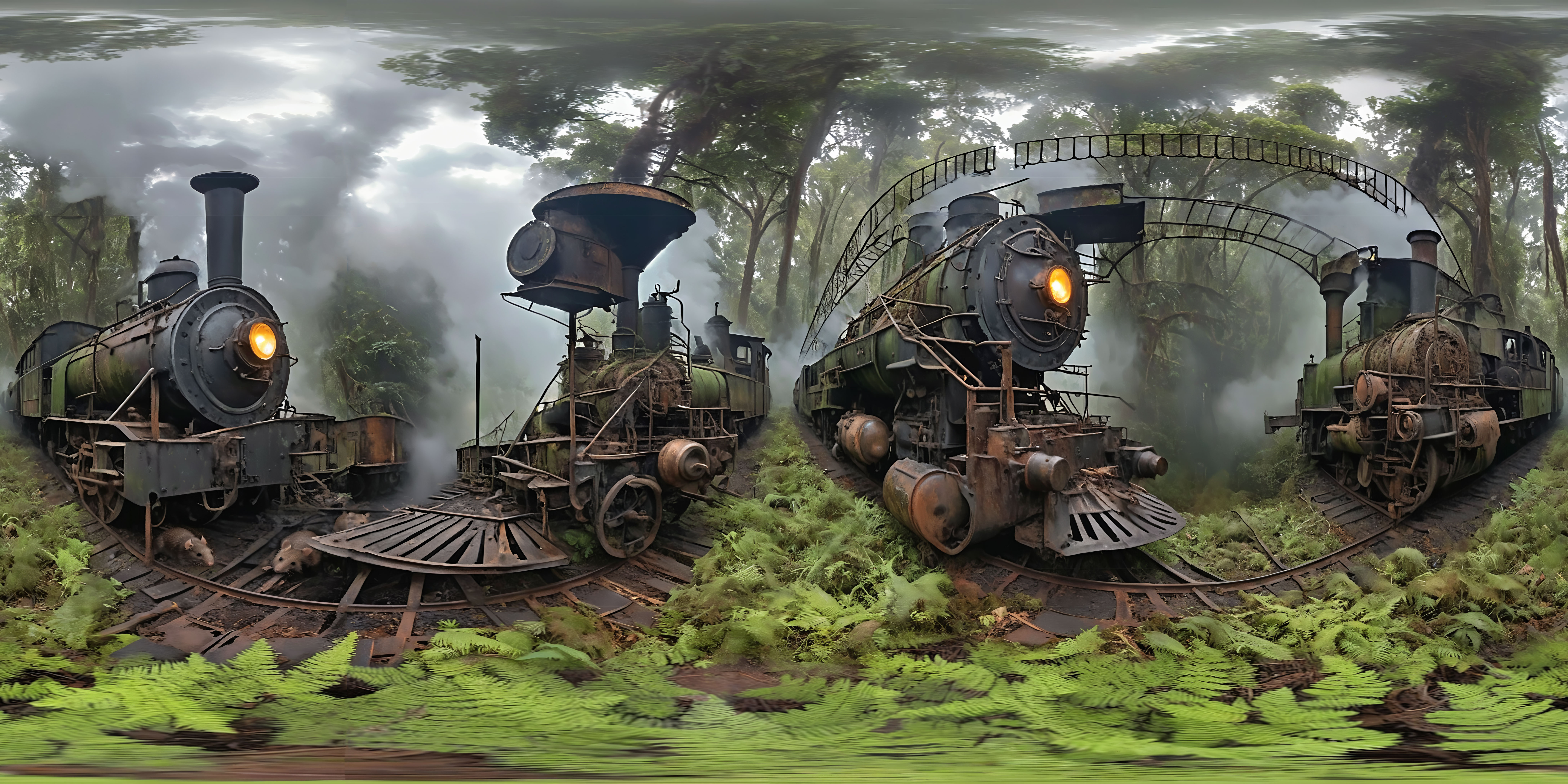 An ancient cellar vault, laboratory, (((a man with white, tangled hair, wearing a white lab coat with a green apron, holding a glass jar from which purple smoke is pouring))), tables, shelves, test tubes, vials, Bunsen burners, flasks, jars, vials, bags and jars made of colored glass, clay, metal, granite, soapstone, precious stone, marble, leather, boxes and boxes with ingredients, colored liquids, powders, hand scales with weights, mortars, various spoons and spatulas, apothecary scoop, glass vessel or pot for cooking, bowl, stand, stirring rod, separating funnel, filter, funnel, sieves, pipettes, a small board and knife, herbs, small pan, smoking spoon, melting ladle, distillation apparatus, glass flask with distillation bridge or reflux condenser, copper still, retort, writing utensils for notes, a small rechaud, teapot, spirit burner, trivet, coaster, cleaning brushes, cloths, hourglasses in various sizes, small bowls, skulls, human skulls with candles on them, animal skulls, shells, gemstones, minerals, documents and books, candles in candlesticks, Lamps, lanterns, mathematical devices, drawing instruments, globe, obscure devices, magnifying glass, a still, pickled animals/organs, eerie lighting mood, gloomy, little illumination, wide angle camera, 360 degrees realistic equirectangular panorama photo,8k, high resolution, photo realistic, rich colors,