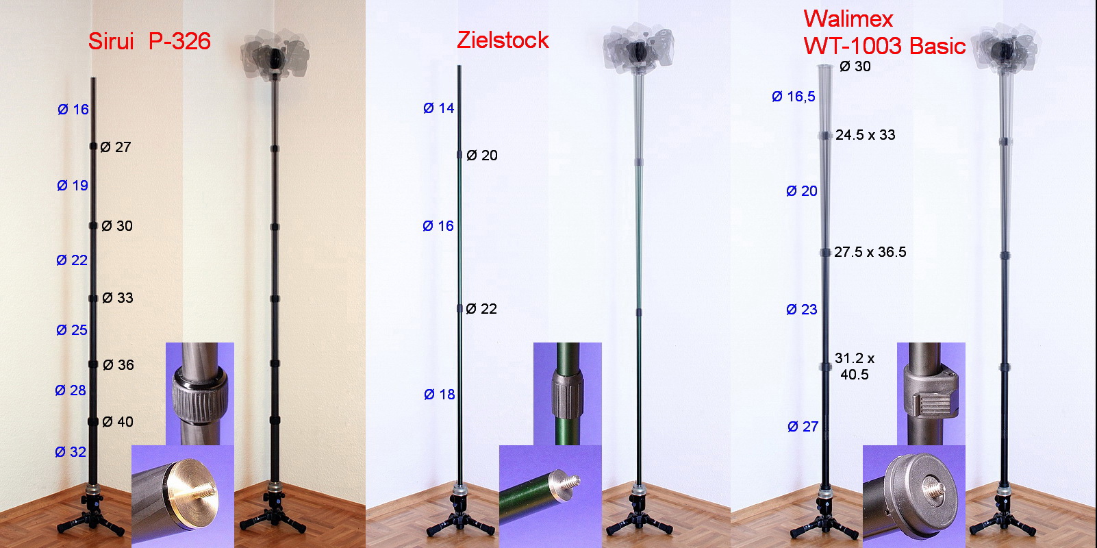 leider eiern sie allerdings schon ohne aufgesetzte Kamera derart daß sie meines Erachtens nicht für diesen Zweck geeignet sind. Dies liegt nicht nur an der Ungenauigkeit der originalen Kamera-Anschraubbasis (billiges Plastikteil mit 1/4" Stahlbolzen) sondern auch daran daß die ausgezogen geklemmten Rohrsegmente nicht zueinander fluchten. Will man für`s Ende des dicken Rohrs einen Rotator-Adapter drehen, der auch den Rundlauf verbessern soll so sei auch erwähnt daß es sich um ein Profilrohr handel daß innen nicht komplett rund ist - das macht es etwas aufwändiger....Kaum teuerer bei weniger Bastelaufwand ist man mit billigen Einbeinern besser bedient. Die wackeln weniger, sind nen Tick kompakter...