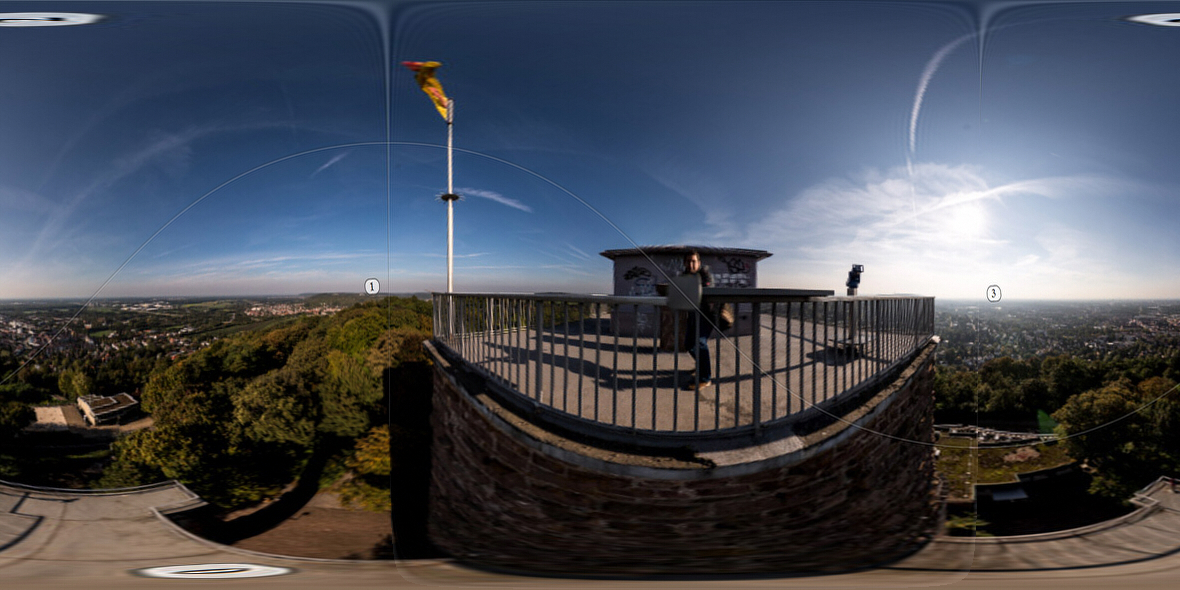 Nehmen wir nun an Du fotografierst einreihig mit großem bertikalem Bildwinkel. Dann musst Du nun brennweitenabhängig horizontal drehen. Ich nutze dafür einen NodalNinja Clickstop-Dingens für Poles der alle 30° stoppt. Damit kann ich sowohl 45°, 60°als auch 90°drehen und die Sphäre voll bekommen. Vorher habe ich die Kamera einfach nach dem ausfahren irgendwohin (Straße, Bauwerk, wasauchimmer) ausgerichtet und dann eben darauf, 90° rechts, davon weg, 90° links gedreht. Manche nehmen auch einen Marker am Boden und legen eine Scheibe (CD oder ähnlich) auf den Boden und machen dort Winkelmarkierungen. Geht alles. Anfangs empfehle ich Dir die den BastlWastl-Workflow, wenn Du Gefallen an den Bildern gefunden hast steht Dir eine reichhaltige, meist NodalNinja-basierende Zubehörpalette offen.