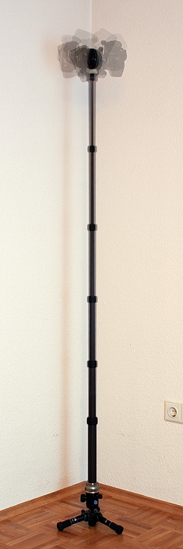 Das obere Ende federt voll ausgefahren zwar auch ein wenig, schwingt aber recht schnell aus, so daß sich im Gegensatz zum Zielstock in dieser Höhe durchaus damit arbeiten lässt. Der Zielstock bog sich voll ausgefahren durch das Kameragewicht derart durch, daß ich die Beine des Stativ weiter spreizen musste damit die Kombination nicht kippt. Nicht so beim Sirui Einbein...