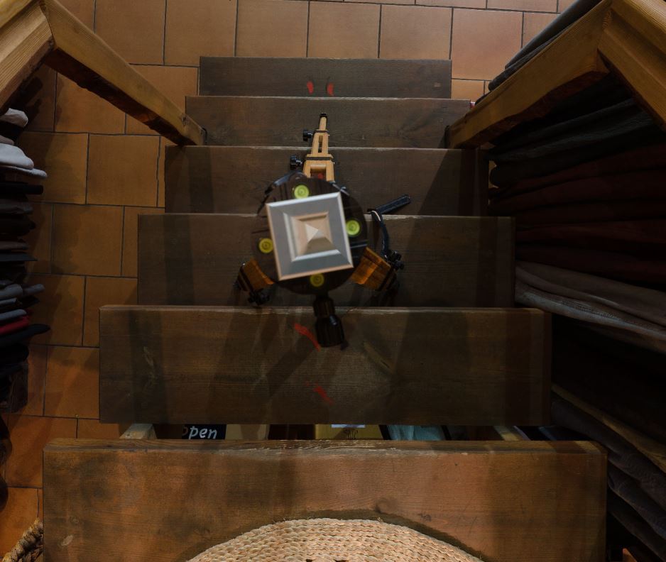 Wenn Du das aber uuuunbedingt so haben willst, musst Du die Kamera im Nodalpunkt behalten, das hast Du sehr richtig erkannt. Je nach Örtlichkeit gibt es dazu verschiedene Methoden. Es gibt Nodalpunktadapter, bei denen sich der Arm, der nach oben zeigt, um 180° nach außen schwenken lässt, so dass die Kamera freien Bodenblick hat. Die Kamera wird dabei um ein bestimmtes Maß horizontal verdreht, die Höhe bleibt aber gleich. Die Kunst besteht nun darin, das Stativ GENAU um dieses Maß zu verschieben, und möglichst NICHT zu verdrehen (eine Schablone kann helfen). Wenn die Treppe breit genug ist, kann das durchaus gelingen. Wenn man viel Zeit hat, und die Ausrichtung perfekt sein muss, würde ich die Position vermessen. Ich habe z.B. einen Linienlaser, einen Lotlaser und einen Meterstab, und kann damit die Position der Kamera auf wenige Millimeter genau dahin setzen, wo sie hingehört.