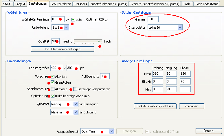 Wer wagt einen Versuch das DAU-tauglich zu erklären und kann mir evtl auch die wichtigsten Pano2QTVR-Einstellungen erläutern oder Einstellungen empfehlen? Kann man generelle Empfehlungen geben welche Auflösung des Ausgangsbildes mit welchen Einstellungen in Pano2QTVR ratsam sind?