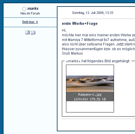 möchte hier mal eins meiner ersten Werke zeigen und gleich eine Frage anhängen. Bin hier wahrscheinlich ein Exote, da ich meine Panoramen mit Mamiya 7 Mittelformat 6x7 aufnehme, außerdem unerfahren bin und bisher mit Photoshop meine Aufnahmen zusammensetze. Wundert euch also nicht über seltsame Fragen. Jetzt steht natürlich die Urlaubszeit an und ich überlege ob es überhaupt möglich ist Langzeitaufnahmen mit Wasser zusammenfügen bzw. ob es möglich ist das Stichen zu erzwingen.