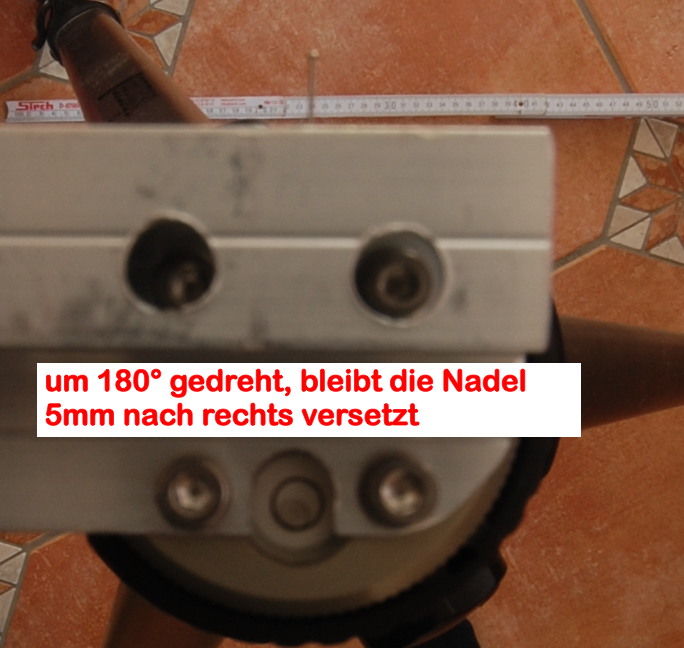 Da mir bei der Linealmethode aufgefallen ist, dass bei einem 90° Schwenk bereits die Markierung sich wegbewegt, habe ich eine Position gesucht, wo die Markierung auf dem Lineal in allen Stellungen stehen bleibt und nicht mehr eiert.