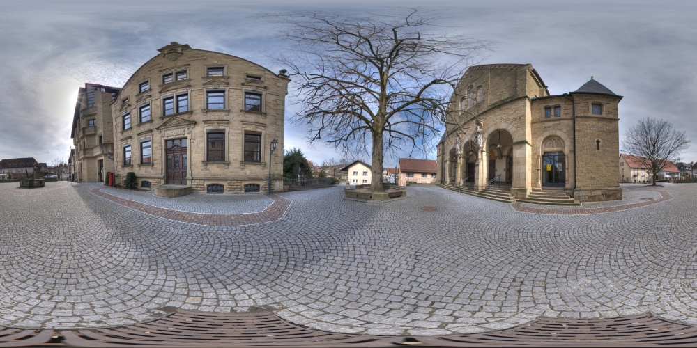 Zur Technischen Seite, habe ich das Pano mit PTGUI ausgeglichen und ich würde sagen der Horizont ist OK der Höhenunterschied auf dem Platz ist der Größeren Entfernung zum Horizont geschuldet da sich hinter dem Baum eine Treppe befindet ist dort